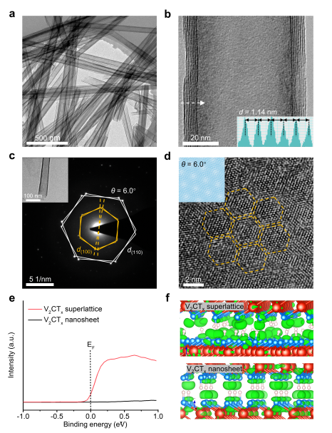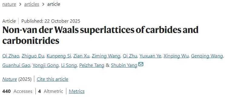 人造超晶格由石墨烯等原子层通过逐层周期性堆叠或顺序外延生长构建而成,已成为开发性能超越现有材料的新材料的多功能平台。然而,目前所探索的超晶格主要是基于范德华(vdW)超晶格受弱界面耦合的约束,严重制约了超晶格材料的发展与应用。北京航空航天大学材料科学与工程学院杨树斌教授联合宫勇吉教授、汤沛哲教授和中国科学技术大学宋礼教授等人,通过一种全新的“刚度介导”合成策略,打破了传统范德华超晶格的桎梏,创造出一类通过氢键耦合的非范德华超晶格新材料。这类材料不仅本身具有优异的电学性能和角度鲁棒性,其薄膜制品更是在电磁屏蔽性能上达到了全球领先水平,为超晶格材料的研究和应用开辟了全新的方向。相关成果于2025年10月22日以全文Article的形式发表于《Nature》杂志,题目为“Non-van der Waals superlattices of carbides and carbonitrides”。 北京航空航天大学材料科学与工程学院赵麒博士为第一作者,北京航空航天大学材料科学与工程学院杨树斌教授为通讯作者,北京航空航天大学材料科学与工程学院为第一单位。