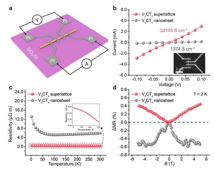 超高电导率:得益于强氢键耦合带来的强层间电子耦合和高载流子浓度(10²² cm⁻³),该非范德华超晶格表现出约30,000 S cm⁻¹的超高电导率,是传统对应材料(如MXene)的22倍