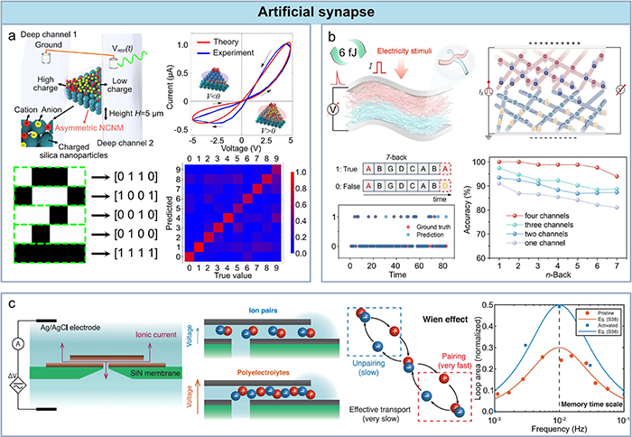 图8. 人工突触应用。(a) 由带电硅纳米粒子组装的纳米流体系统用于纳米流体离子忆阻器的示意图,以及基于硬件非线性特性和算法协同优化的高效计算范式。(b) 用于离子调控的硬件结构示意图,由PVDF纳米纤维膜组装的纳米流体膜构成,应用于复杂的计算任务。(c) 基于MoS₂纳米片组装的纳米流体器件中动态离子调控的硬件-算法协同设计计算架构示意图。