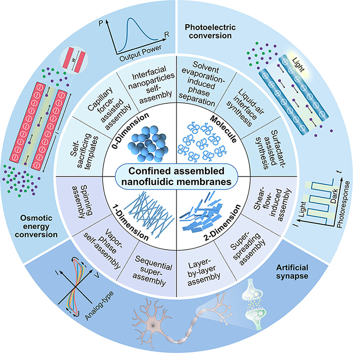 自然界生物系统经长期进化形成卓越功能结构、优异机械性能与高效信息传输,通过生物分子和纳米结构的限域组装实现低能耗、高效率特征;研究其超浸润系统(尤其细胞膜离子纳米通道与离子泵),为模仿其微 / 纳观结构、化学成分及组装策略提供灵感,推动仿生纳米流体膜发展并在能量转换、光电转换、智能传感、离子分离与纳米流体器件等关键领域取得突破,本文将聚焦跨分子、0D、1D、2D 多维度超浸润纳米材料的限域组装,介绍纳米流体膜的最新发展。