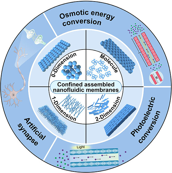 受生物离子通道启发,纳米流体膜因能实现高效离子传输以模仿生命体精确输运功能获广泛关注;通过可调理化性质的超浸润纳米材料限域组装,这类仿生系统展现出优异离子传输性能与结构稳定性,成为多领域有力候选。本篇综述概述仿生纳米流体膜最新发展,围绕分子、零维(0D)、一维(1D)、二维(2D)纳米材料的维度特征展开讨论,提出合理构建该膜的通用设计框架(重点整合材料选择、组装过程与功能调节以优化离子传输性能),随后介绍其关键应用(尤其渗透能转换、光电转换与人工突触),最后展望发展挑战与前景,旨在为超浸润纳米材料限域组装构建高性能仿生纳米流体膜提供广泛知识基础。