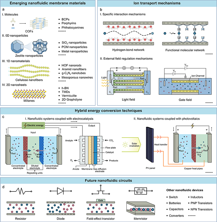 图9. 仿生纳米流体膜的挑战与展望。(a) 基于分子、0D、1D和2D纳米材料的新兴纳米流体膜材料。(b) 基于仿生纳米流体膜的离子传输机制。(c) 基于纳米流体系统的混合能量转换技术。(d) 未来的纳米流体电路。