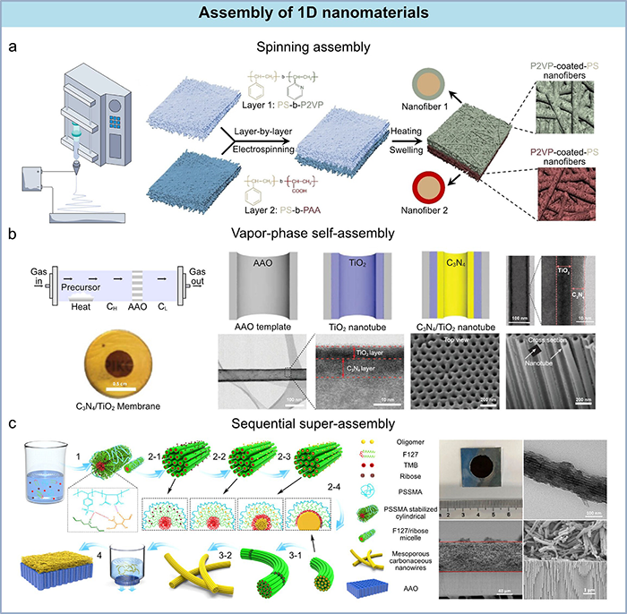 图4. 1D纳米材料组装的构建策略。(a) 静电纺丝诱导的纳米纤维组装示意图