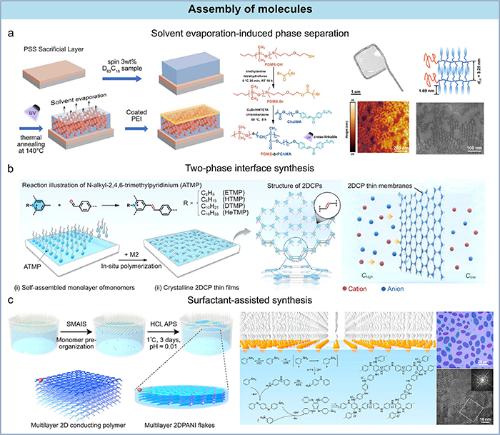 图2. 分子组装的构建策略。 (a) 利用溶剂蒸发诱导相分离制备纳米多孔膜的示意图。该方法包括旋涂聚苯乙烯磺酸钠(PSS)牺牲层,涂覆嵌段共聚物溶液,利用溶剂蒸发和紫外交联形成膜,最后去除牺牲层。(b) 通过液-气界面合成组装两亲性吡啶基单体的示意图。该方法利用疏水相互作用引导两亲性单体自组装成有序单层,然后通过界面缩聚形成结晶薄膜。(c) 通过表面活性剂单层辅助界面合成组装苯胺的示意图。该方法利用表面活性剂的亲水头和疏水尾基团调控单体预组织,从而通过界面聚合合成聚苯胺晶体。