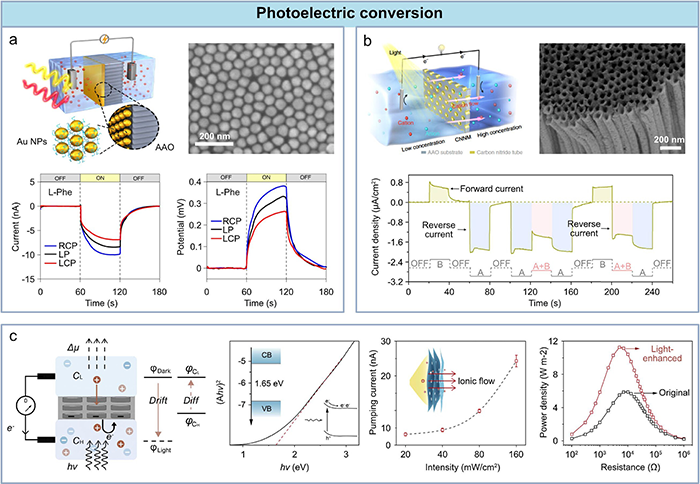 图7. 光电转换应用。(a) Au NPs组装的纳米通道膜用于纳米流体离子光电转换的示意图及光响应曲线。(b) 基于碳纳米管(CNTs)的纳米通道用于光驱动离子泵,以及由不同方向、不同功率密度的光产生的交流电示意图。(c) 石墨二炔氧化物组装的纳米通道膜用于光辅助渗透能转换的示意图及光强度依赖的光电流曲线。