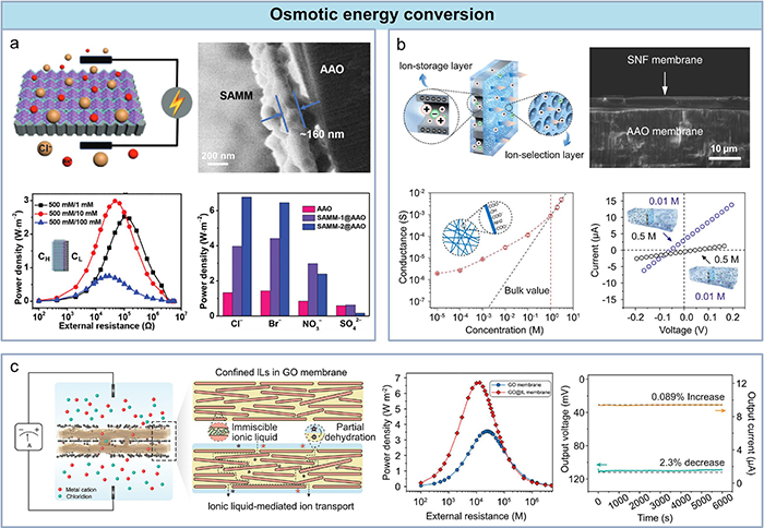 图6. 渗透能转换应用。(a) 由UiO-66-NH₂纳米粒子组装的纳米通道膜用于基于阴离子交换膜的反向电渗析的示意图及功率输出曲线。(b) 由丝素纳米纤维组装的纳米通道膜用于基于阳离子交换膜的反向电渗析的示意图及电化学性能曲线。(c) GO/IL纳米流体膜的示意图及输出曲线,突出离子液体介导的在受限纳米通道中的传输以增强渗透能转换。