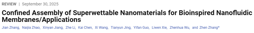 今天带来的是中国科学技术大学张振教授课题组2025年9月30日发表在ACS Nano的综述文章,题目为”Confined Assem)bly of Superwettable Nanomaterials for Bioinspired Nanofluidic Membranes/Applications”。本文的第一作者是Jian Zhang和Naijia Zhao,本文的通讯作者是Zhen Zhang。