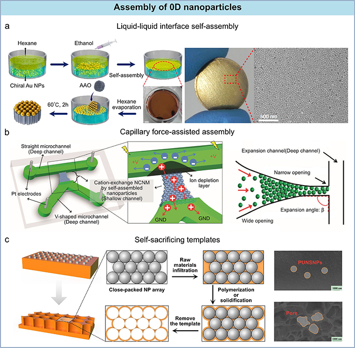 图3. 0D纳米粒子组装的构建策略。(a) 金纳米粒子(Au NPs)液-液界面组装的示意图。该策略利用Au NPs表面的两亲性L-Phe配体驱动相邻纳米粒子的空间有序排列,形成手性超结构膜。(b) 毛细作用力辅助的原位纳米粒子组装示意图。在微流控通道内,毛细作用力通过原位组装构建离子选择性纳米通道膜。(c) 用于反向纳米粒子组装的牺牲模板法示意图。纳米粒子组装体作为模板,随后通过化学蚀刻生成反向纳米通道膜结构。