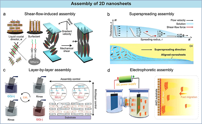 图5. 2D纳米片组装的构建策略。(a) 剪切流诱导的纳米片排列示意图。在高粘度体系(如液晶)中,定向剪切力驱动微/纳尺度片的有序组装,形成纳米通道膜。(b) 超铺展诱导的纳米片排列示意图。液体超铺展过程中产生的面内剪切力驱动纳米片在界面处高度定向组装,形成纳米通道膜。(c) 纳米片的逐层自组装示意图。通过静电相互作用交替沉积带相反电荷的纳米片,构建自组装纳米通道膜。(d) 电泳诱导的纳米片组装示意图。带电纳米片在电场作用下向带相反电荷的电极迁移并沉积,形成纳米通道膜结构。