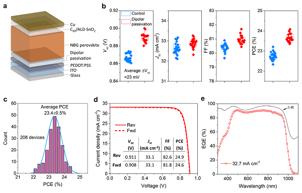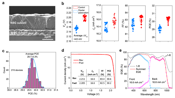 图4 采用偶极钝化的全钙钛矿叠层太阳能电池的光伏性能 © 2025 Springer Nature