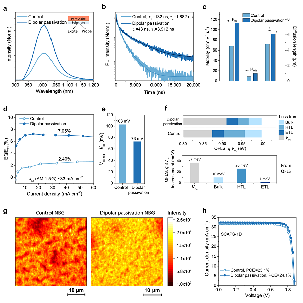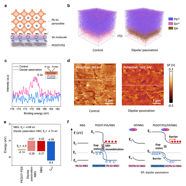 图3 采用偶极钝化的混合Pb-Sn窄带隙钙钛矿太阳能电池的光伏性能 © 2025 Springer Nature