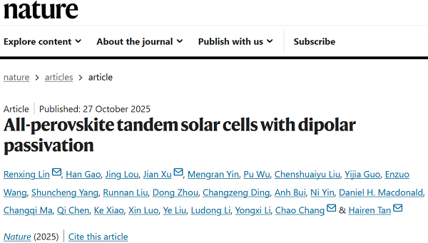 原文详情:All-perovskite tandem solar cells with dipolar passivation (Nature 2025, DOI: 10.1038/s41586-025-09773-7)