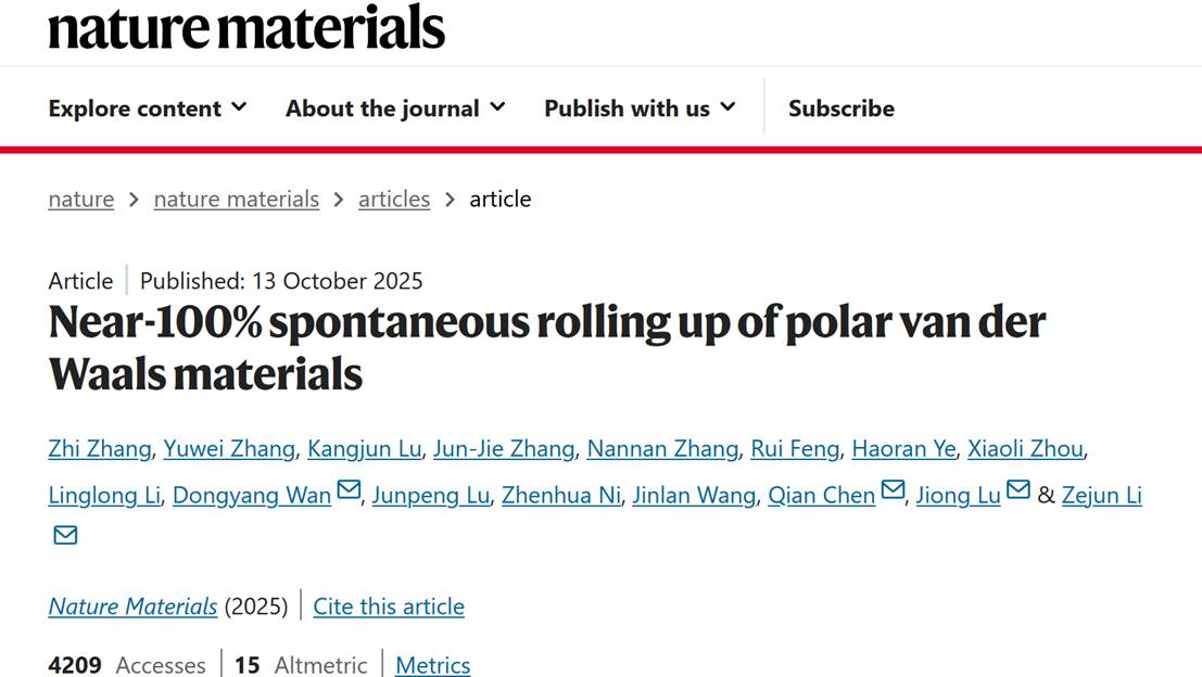 近日,东南大学物理学院李泽军教授、新加坡国立大学化学系吕炯教授、东南大学物理学院陈乾教授、万东阳教授在Nature Materials上发表了题为“Near-100% spontaneous rolling up of polar van der Waals materials”的论文,该研究通过电化学插层/剥离过程实现极性范德华材料的自发卷曲,制备出具有可控方向和高产率的一维纳米卷。研究首次实现了基于内在极化驱动力的可规模化自卷纳米结构制备,开辟了设计量子固体和范德华超晶格的新途径。