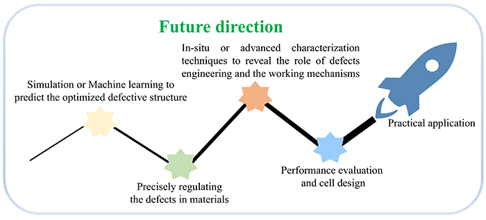 作者提出了缺陷工程在未来水系锌离子电池研究中的主要发展方向:应借助模拟计算与机器学习等方法预测并优化缺陷结构,以加速高性能材料的理性设计;在此基础上,发展原子层沉积等精准合成技术,实现对缺陷类型、浓度与分布的有效调控;同时需结合原位/先进表征技术,在原子尺度实时监测缺陷在电化学过程中的动态演化,深入理解其作用机制;还应建立系统的性能评估体系,量化缺陷与性能的构效关系,全面评估其实际工况表现;最终,通过推动产学研合作以解决规模化制备与成本问题,并系统考察其长期循环稳定性与安全性,从而促进缺陷工程锌离子电池在电动汽车、规模储能等领域的实际应用。