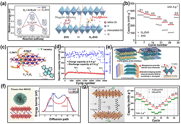 钒基正极材料凭借其丰富的价态与多样的晶体结构,已成为水系锌离子电池中极具前景的储锌载体。通过缺陷工程可有效调控其性能:构筑氧空位或钒空位能够显著降低Zn2+的扩散势垒并减弱静电相互作用,从而同时提升材料的比容量与循环稳定性(图4a-d)。此外,异原子掺杂是另一关键改性策略:例如,在NaVO中实施梯度氮掺杂可构建内置电场,不仅增强了电子导电性,还促进了Zn2+的吸附与扩散,使材料在100 A g-1的超高倍率下仍能保持110 mAh g-1的容量,并稳定循环50000次(图4e);而镁离子掺杂则能拓宽离子传输通道、降低迁移能垒,并通过预嵌离子效应稳定晶体结构、抑制副反应,使改性电极在5000次循环后容量保持率高达90.2%(图4f)。值得强调的是,空位与掺杂的协同策略(如兼具氮掺杂与氧缺陷的氧化钒纳米管)可诱导产生快速的反应动力学、优异的储锌能力、高倍率性能及长循环寿命(图4g)。