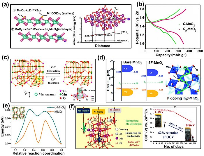 1)在正极材料中,缺陷工程能够:i)增加活性位点并增强对锌离子的吸附能力,从而提升循环比容量;ii)提高离子/电子导电性,促进Zn²⁺迁移,改善倍率性能;iii)稳定材料晶体结构,实现长循环稳定性。