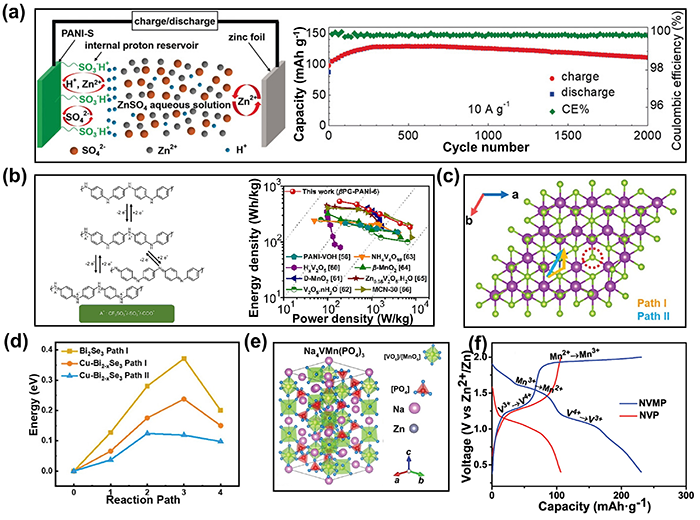 在有机正极方面,具有共轭多孔结构的聚苯胺(PANI)是研究热点。通过自掺杂磺酸基团(-SO3–)可作为内部质子源,使其在弱酸性电解液中维持高效的氧化还原反应,从而在2000次循环中保持100%的库伦效率,并在电流密度增大50倍时容量保持率达70%(图7a)。而采用萘磺酸(β-NSA)与石墨烯酸(GA)共掺杂的PANI,则利用高结晶度结构与弱酸基团形成高密度质子储备,结合GA的优异导电性与柔性,协同加速反应动力学并缓冲体积变化,最终使组装的锌离子电池同时实现535.31 Wh kg-1的高能量密度与7378.01 W kg-1的高功率密度(图7b)。该掺杂策略在其他无机正极材料中同样成效显著。例如,Cu掺杂可诱导Bi2Se3产生Bi空位,从而提高体相电导率与Zn2+吸附能,并降低迁移能垒,使材料展现出320 mAh g-1的高容量及4000次长循环稳定性(图7c,d)。此外,V/Mn共掺杂的NASICON材料成功激活了两对过渡金属氧化还原电对,使其在0.1 A g-1下的比容量提升至230.7 mAh g-1,并展现出309.7 Wh kg⁻¹的高能量密度及在5.0 A g-1下3000次循环后89.1%的容量保持率(图7f)。这些工作共同表明,精准的缺陷调控是优化各类正极材料储锌性能的有效途径。