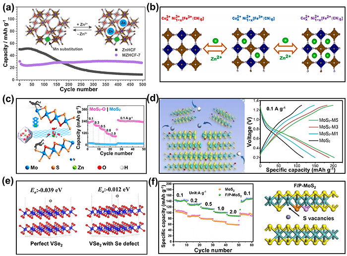 普鲁士蓝类似物(PBAs)因其高工作电压、成分可调及开放的框架结构,成为水系锌离子电池的理想正极材料之一。然而,其本征导电性受晶格空位和结晶水含量等因素制约,过量空位更会引发骨架坍塌与晶格无序,反而降低电化学性能。因此,元素掺杂被证实为一种更有效的改性路径。例如,在普鲁士蓝类似物中引入少量Mn,可协同增强材料电化学稳定性,有效抑制晶相转变并减少溶解,使电极在500次循环后容量保持率高达94%(图5a)。类似的,Co-Ni共掺杂能够降低晶格水含量、增加活性位点,从而实现高度可逆的Zn2+嵌入/脱出,使电极在5000次循环后仍保持84%的容量(图5b)。这些结果均表明,合理的掺杂策略可显著优化普鲁士蓝类似物的结构稳定性与综合电化学性能。