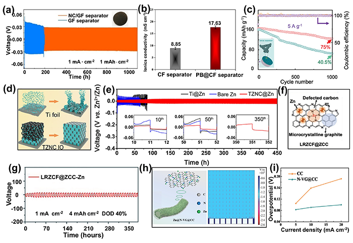 在锌离子电池中,隔膜与集流体作为关键组分,其性能可通过缺陷工程实现显著优化。通过在材料中设计特殊结构与引入掺杂元素,可有效调控界面电场与离子传输行为。例如,利用氮掺杂碳涂层修饰玻璃纤维隔膜,可提高锌离子迁移数,其强亲锌性有助于降低成核过电位并均化界面电场,使对称电池在1 mA cm-2下稳定运行1100小时,并使全电池在5 A g-1下循环1000次后容量保持率达79%(图10a)。采用富含氮氧官能团的多孔碳材料修饰隔膜,可将离子电导率提升至17.63 mS cm-1,显著增强锌沉积/溶解的可逆性(图10b)。在集流体方面,构建由非晶TiOx与Zn/N共掺杂碳组成的结构,其有序多孔网络可均匀化电场与离子流分布,使对称电池在1 mA cm-2下稳定运行450小时(图10d,e)。仿莲藕多通道碳纤维骨架与表面氮掺杂碳笼复合集流体,利用曲率驱动的电荷局域化效应引导锌有序成核,在40%放电深度下实现380小时稳定循环(图10f,g)。此外,在碳布上原位生长氮掺杂垂直石墨烯阵列,可通过含氮基团配位作用将Zn2+成核过电位降至83 mV,并实现>95%的库伦效率(图10h,i)。上述策略通过构筑亲锌位点、优化电场分布及离子传输路径,有效促进了锌的均匀沉积并抑制了副反应,为高性能锌基电池的设计提供了重要参考。