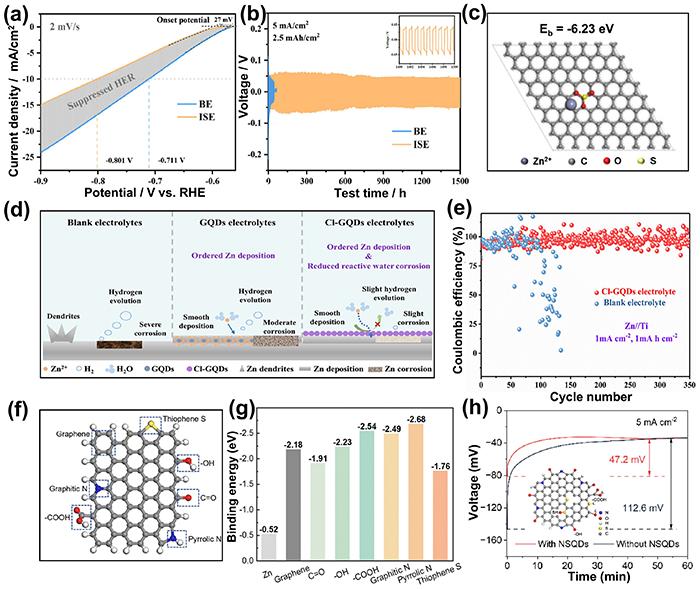 在电解质添加剂中引入缺陷工程,主要是通过向碳点等碳基纳米结构中掺杂杂原子(如N、S、Cl)或嫁接官能团(如-SO3–),以增强其亲锌性并精准调控锌沉积行为。具体而言:锌掺杂碳量子点可自发吸附于锌负极表面,重构界面双电层并提高析氢过电位(图9a),使电池在5 mA cm-2下稳定循环超过1500小时(图9b);-SO3–功能化碳点则兼具强锌亲和力与静电屏蔽效应(图9c),能有效抑制水引发的副反应,将Zn||Zn对称电池寿命延长至4000小时以上;氯化石墨烯量子点通过其周期性吸附/脱附行为,构建动态自适应界面,持续引导锌均匀成核,并利用局部疏水性保护负极(图9e);而N/S共掺杂碳量子点(NSQDs)凭借与Zn2+的高结合能,将成核过电位从112.6 mV显著降至47.2 mV,提供丰富成核位点,使Zn||Zn对称电池在20 mA cm-2的高倍率下稳定运行6000次循环。这些功能化添加剂通过协同优化界面环境与沉积动力学,显著提升了锌负极的循环寿命与可逆性。