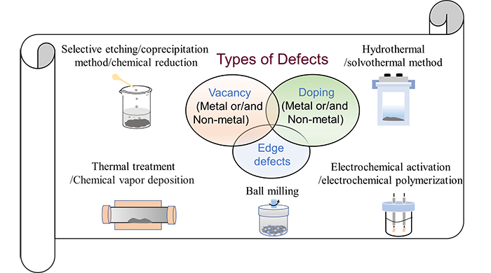 图2首先将缺陷类型划分为空位(金属/非金属)、掺杂(金属/非金属)及边缘缺陷,随后系统综述了各类缺陷在水系锌离子电池中的具体制备方法。