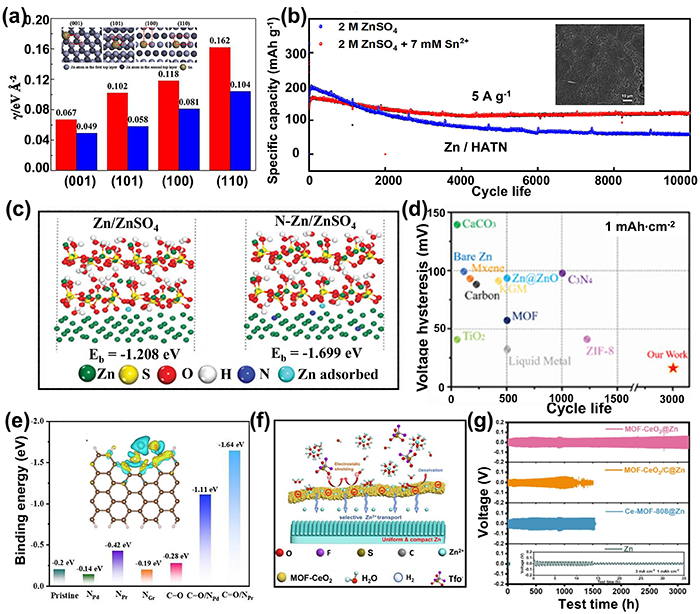 锌负极面临的枝晶生长、腐蚀及析氢反应等问题严重制约了其实际应用。缺陷工程为构建稳定锌负极界面提供了可行的解决路径:异质原子掺杂可有效调控锌沉积行为,例如Sn掺杂通过降低表面能诱导锌均匀沉积(图8a),使全电池在10,000次循环后仍保持118.1 mAh g-1的容量(图8b);N掺杂则通过优化Zn2+吸附位点(图8c),促进其均匀成核,使负极在1 mA cm-2下呈现出约23 mV的低过电位和超过3000小时的循环寿命(图8d)。进一步地,N/O共掺杂碳材料通过协同作用增强Zn2+捕获能力,有效降低成核势垒(图8e);而MOF衍生的CeO2高缺陷保护层则利用其负电性与多孔结构,促进锌离子去溶剂化并实现均匀分布,使对称电池在2 mA cm-2下稳定运行3200小时,且库伦效率高达99.5%(图8f, g)。这些策略通过优化界面相互作用与离子传输动力学,共同提升了锌负极的循环稳定性与安全性。