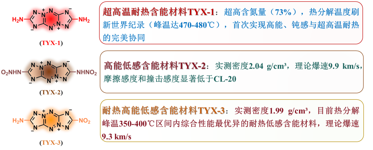 TYX系列含能材料的成功研制,标志着我国在高性能含能材料领域取得重大原创突破,犹如一把精准的钥匙,解开了困扰国际含能领域近百年的“不可能三角”之锁—首次在单一分子骨架上同步实现了高能量密度、低感度和高热稳定性的协同提升。这一突破源于创新的分子设计与电子结构调控,依托“高氮核心骨架”与“一骨架,三协同”的设计理念,融合高氮含量、平面共轭结构及密集氢键网络等多重协同机制,从微观层面奠定了宏观性能的全面飞跃。