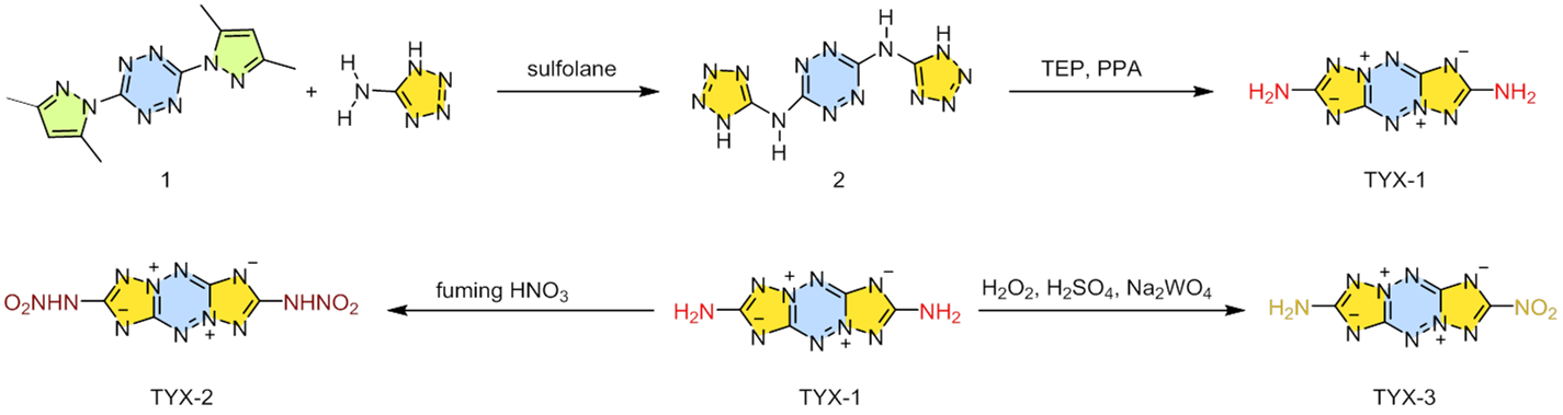 更令人称道的是,该团队同步开发出仅需2–3步的高效合成工艺,成功实现TYX系列含能材料的规模化制备,且全程规避高敏感中间体,为未来工程转化打下坚实基础。