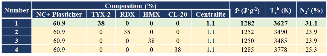 在典型三基发射药体系中(表2)引入TYX-2,火药力较RDX/HMX体系提升约30 J·g-1,燃烧产物中氮气含量达31.1%,爆温降低超过150 K,显著抑制烧蚀、提升热安全性并延长使用寿命