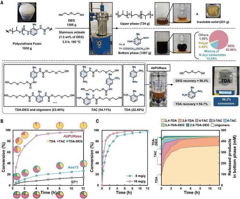 图3 BASF聚氨酯泡沫的化学-酶法解聚过程及千克级规模应用© 2025 AAAS