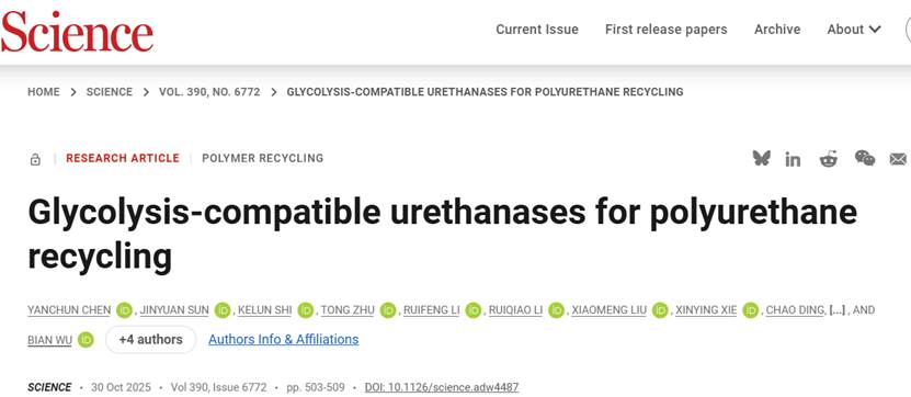 文献链接:Yanchun Chen et al., Glycolysis-compatible urethanases for polyurethane recycling. Science 390, 503-509 (2025). DOI:10.1126/science.adw4487