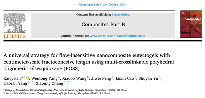 相关研究论文以“A universal strategy for flaw-insensitive nanocomposite eutectogels with centimeter-scale fractocohesive length using multi-crosslinkable polyhedral oligomeric silsesquioxane (POSS)”为发表在国际知名期刊《Composites Part B-Engineering》上。郑州轻工业大学材料与化学工程学院樊凯奇副教授为论文第一作者兼通讯作者,硕士研究生杨文通为论文第二作者,杨皓然副教授、张晓静教授为论文通讯作者。