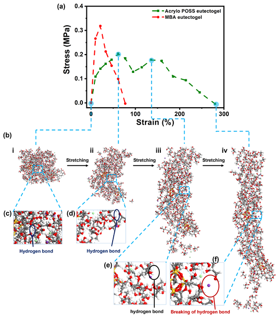 图2.共晶凝胶分子尺度增韧机制的分子动力学模拟。(a)应力-应变曲线。(b)POSS基共晶凝胶的拉伸过程。(c–f)POSS基共晶凝胶界面相互作用机制的瞬态图像。