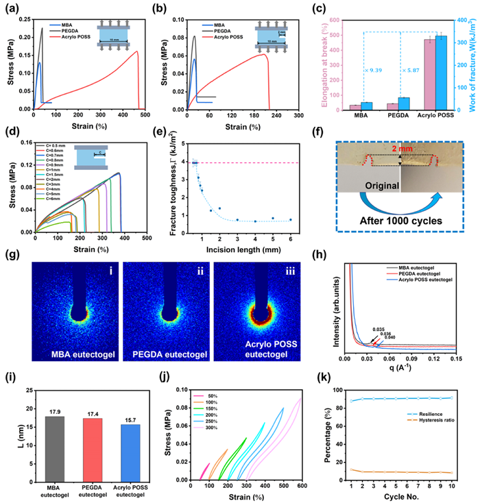 图1. (a)采用不同交联剂的完整共晶凝胶应力-应变曲线。(b)采用不同交联剂且具有2毫米切口的共晶凝胶应力-应变曲线。(c)不同交联剂的共晶凝胶断裂伸长率与断裂功。(d)不同切口长度POSS基共晶凝胶的应力-应变曲线(C为切口长度)。(e) POSS基共晶凝胶不同切口长度下的断裂韧性。(f)经1000次拉伸循环后POSS基共晶凝胶的对比(切口长度=2 mm)。(g) 二维小角X射线散射图谱:i) MBA基共晶凝胶,ii) PEGDA基共晶凝胶,iii) POSS基共晶凝胶。(h)不同共晶凝胶的SAXS光谱。 (i)不同共晶凝胶的晶格间距。 (j) POSS基共晶凝胶在不同应变下的加载与卸载曲线。(k) POSS基共晶凝胶在10次加载-卸载循环中的弹性模量与滞后比。