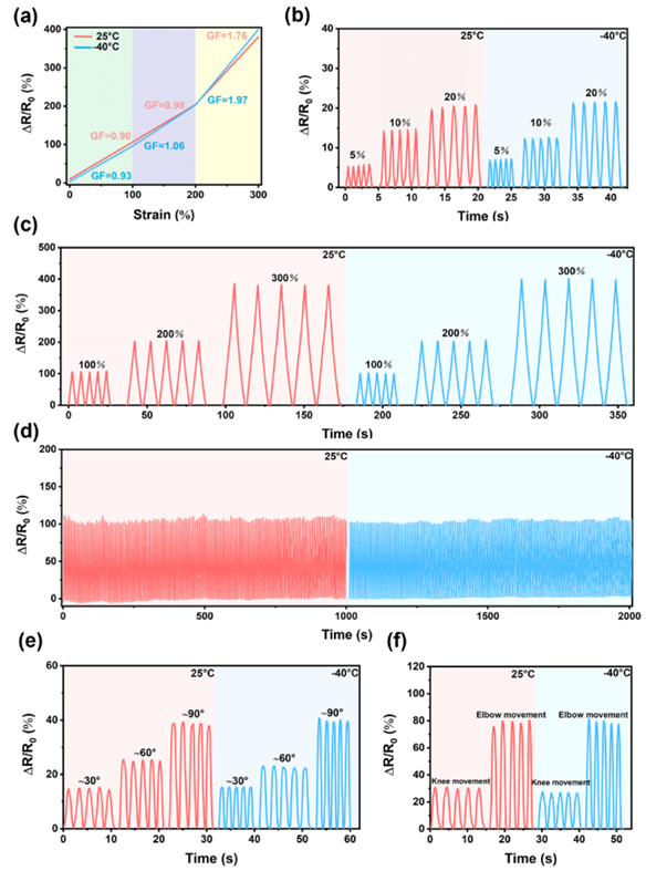 图5.共晶凝胶应变传感器的传感性能(25℃与-40℃):(a)不同应变范围下的GF值。(b)小应变(5%、10%、20%)。(c) 大应变(100%、200%、300%)。(d)100%应变下200次循环测试。(e)不同弯曲角度的手指(30°、60°、90°)。(f)膝关节运动与肘关节运动。
