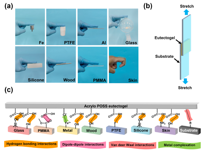 图3. (a)基于POSS的共晶凝胶附着于人体皮肤及其他材料的照片。(b)基于POSS的共晶凝胶搭接剪切试验示意图。(c)基于POSS的共晶凝胶附着于不同基材的粘附机制。