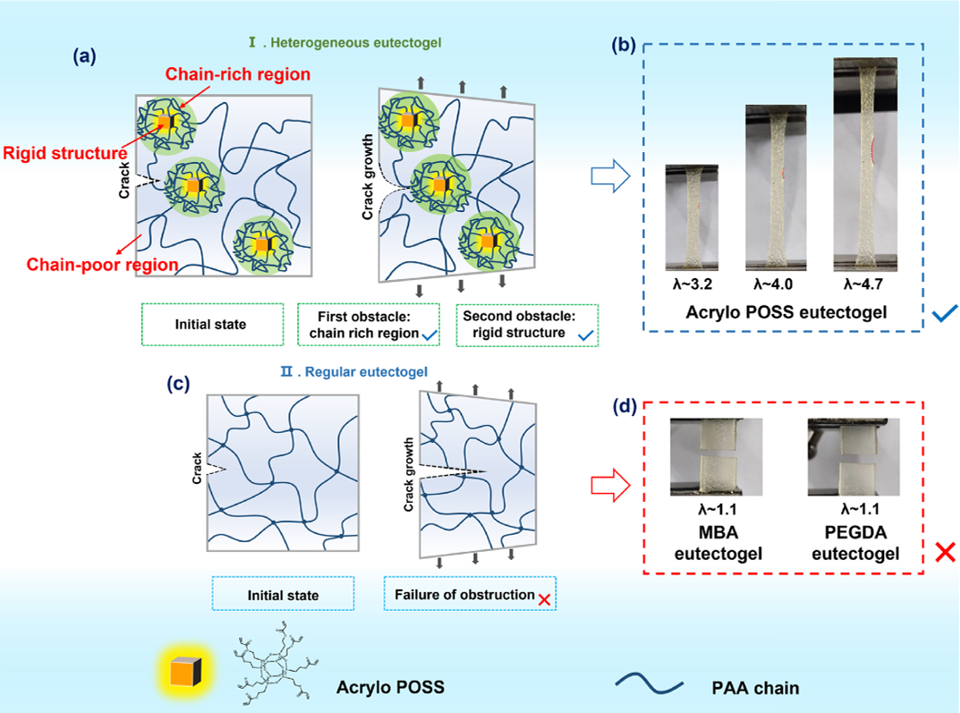 示意图1. (a) 基于 POSS 的共晶凝胶网络抗撕裂的示意图。 (b) 基于 POSS 的共晶凝胶抗撕裂拉伸图(切口长度=0.5 mm)。 (c) 常规共晶凝胶网络抗裂纹失败的示意图。 (d) MBA 基共晶凝胶和 PEGDA 基共晶凝胶抗撕裂失败拉伸图(切口长度=0.5 mm)。