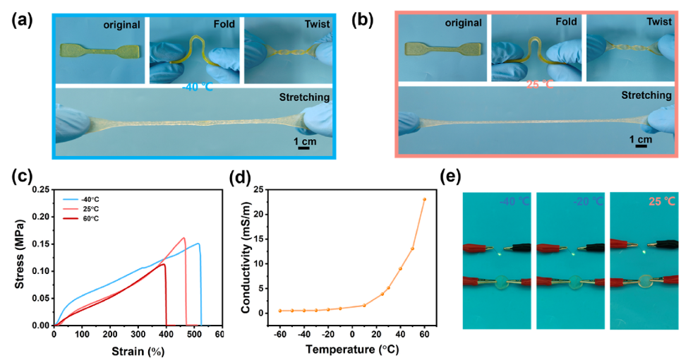 图4. (a) POSS基共晶凝胶在-40℃环境下放置24小时后初始、折叠、扭曲及拉伸状态下的照片。(b) POSS基共晶凝胶在25℃环境下放置24小时后的初始、折叠、扭曲及拉伸状态照片。(c) POSS基共晶凝胶在-40℃、25℃和60℃下的应力-应变曲线。(d) POSS基共晶凝胶在不同温度下的电导率。(e) POSS基共晶凝胶在-40℃、20℃和25℃下连接二极管的照片。(e) POSS基共晶凝胶在-40℃、20℃和25℃下连接二极管的照片。
