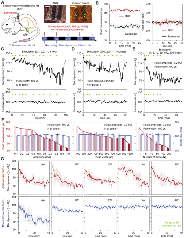 研究团队进一步在自发性高血压大鼠模型中开展了功能验证。结果显示,采用该黏附接口对深腓神经进行电刺激可持续四周有效调控血压,平均下降约37%,且未引发心率下降等副作用。相比之下,传统缝合式非黏附电极在一周后性能急剧下降,失去调控作用。