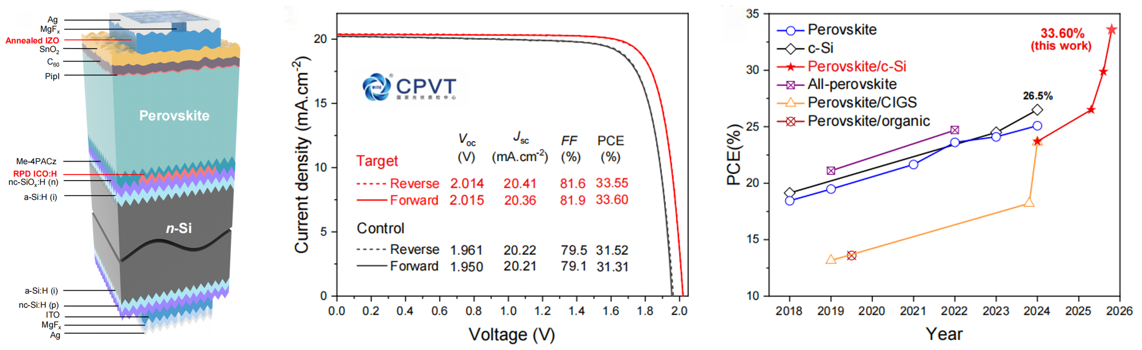 通过上述TCO复合层和电极性能调控,研究团队制备的柔性钙钛矿/晶硅叠层电池实现了33.6%的认证效率,开路电压达到创纪录的2.015 V,刷新了当前柔性叠层电池的效率纪录,进一步缩小了柔性叠层器件与刚性器件在效率方面的差距。