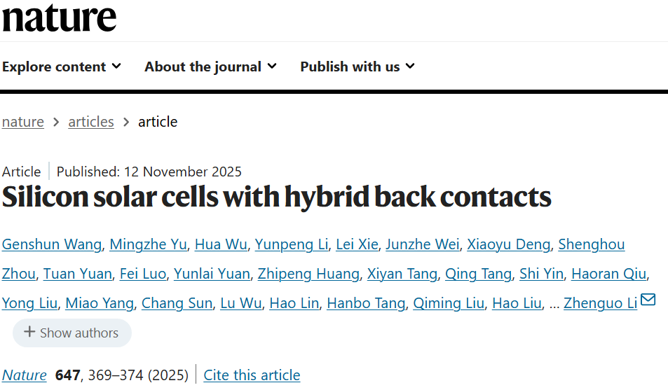原文信息:Wang, G., Yu, M., Wu, H. et al. Silicon solar cells with hybrid back contacts. Nature 647, 369–374 (2025).