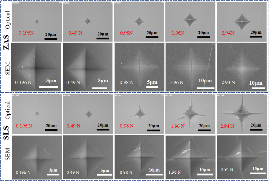 图1不同载荷下ZAS和SLS玻璃压痕的光学显微和扫描电镜形貌图