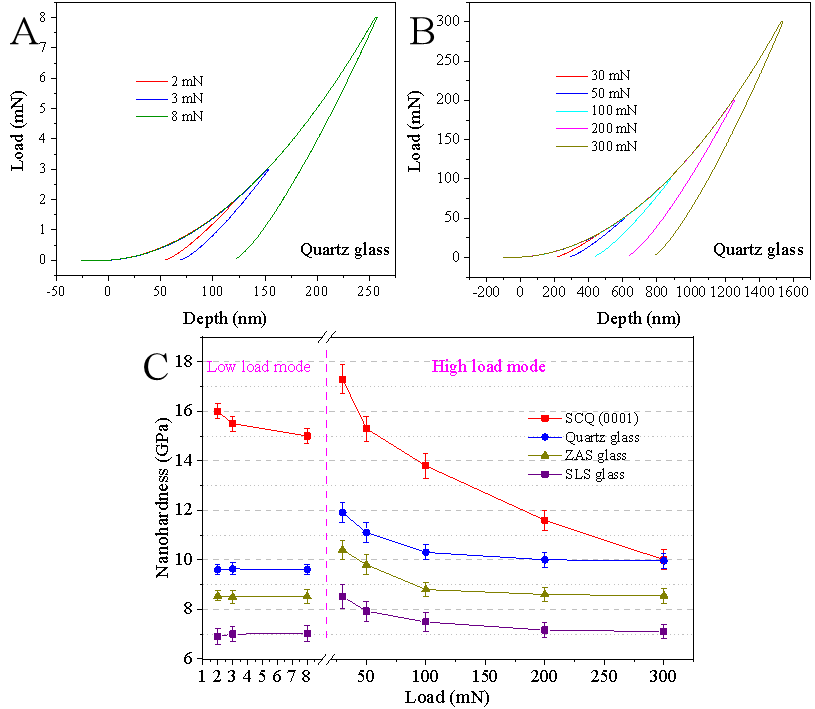 图4 (A)电容位移传感器模式下石英玻璃的载荷-位移曲线;(B)机械式移传感器模式下石英玻璃的载荷-位移曲线;(C)ZAS玻璃、SLS玻璃、石英玻璃及单晶石英不同载荷下的纳米硬度