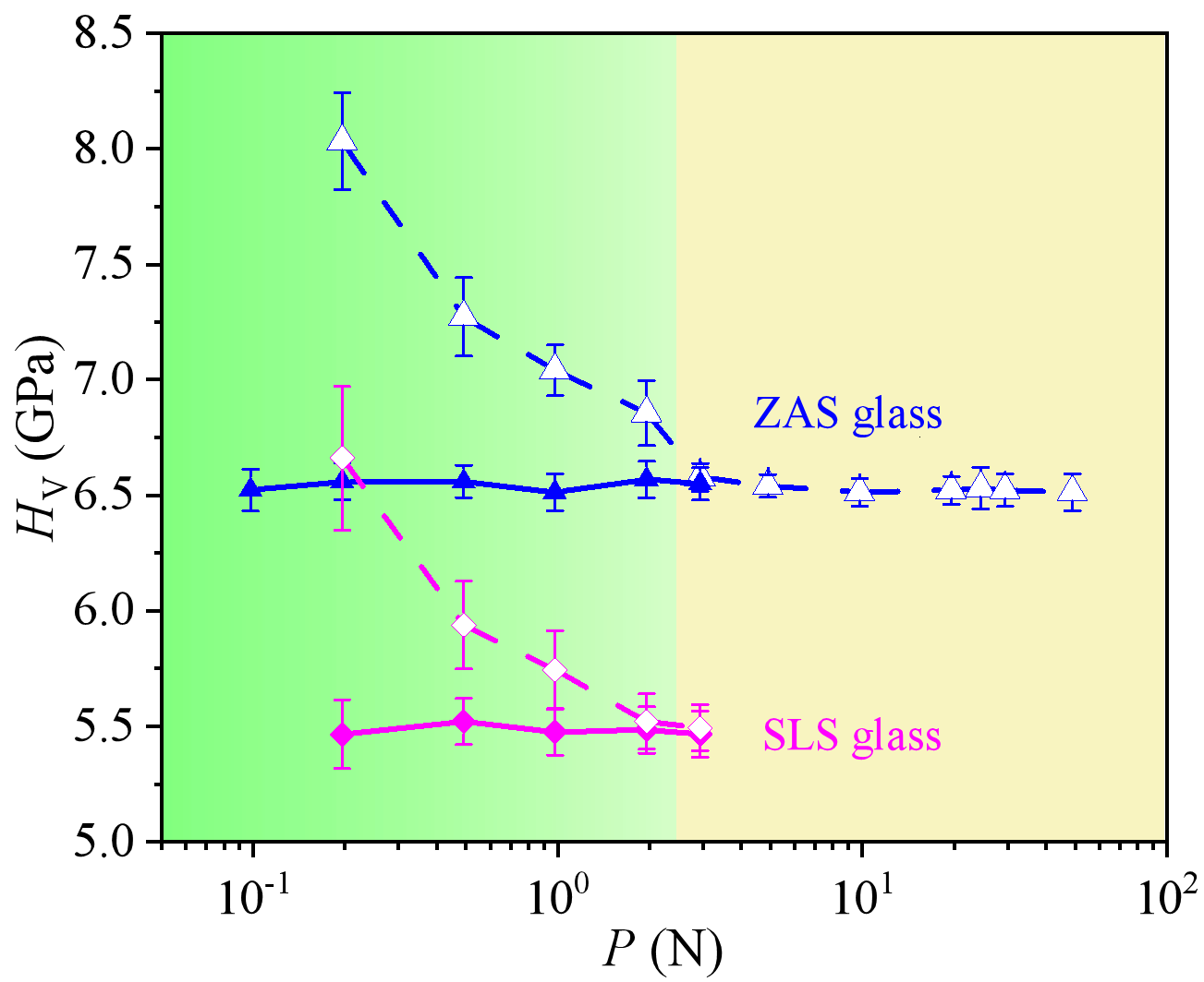 图3 ZAS和SLS玻璃通过光学显微镜和扫描电镜测量的d值计算的HV与载荷P的相关性