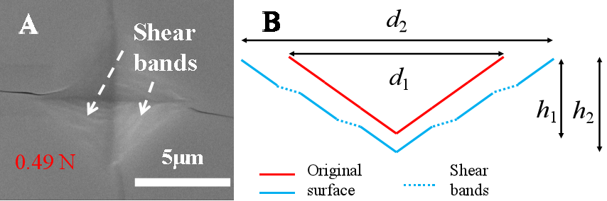 1. 在晶体、金属玻璃等材料中,普遍存在ISE现象。并且,不像无机氧化物玻璃中报道的低于某一临界载荷后才出现ISE现象,晶体、金属玻璃等材料中则不存在硬度随载荷变化保持常数的稳定区域。详细的结构表征在晶体、金属玻璃等材料中观测到了明显的剪切带,并基于该现象的出现将导致压痕接触面积增加,很好地解释了晶体、金属玻璃中ISE现象的物理机制。而在氧化物玻璃中,仅在加载时间长达数十甚至数百秒的条件下,才会观测到剪切带现象;在标准的硬度测试条件(加载时间一般为2-8秒)下,未观察到明显的剪切带现象。因而无法利用剪切带理论解释氧化物玻璃中观测到的ISE现象。