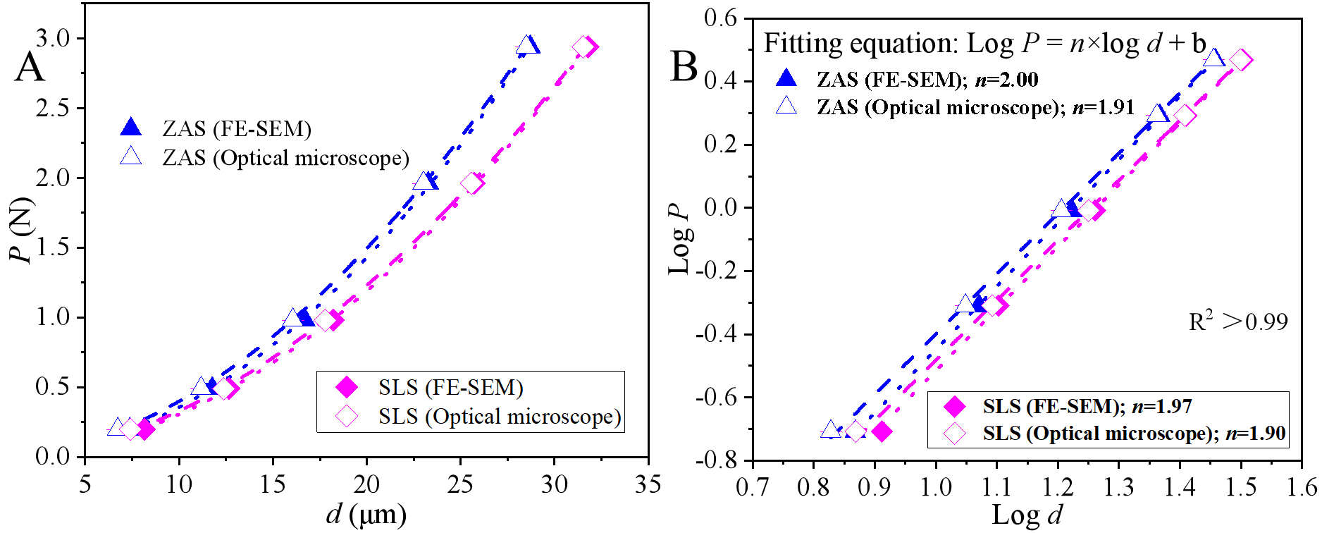 图2 (A)载荷P和d值相关性;(B)Log P和Log d相关性