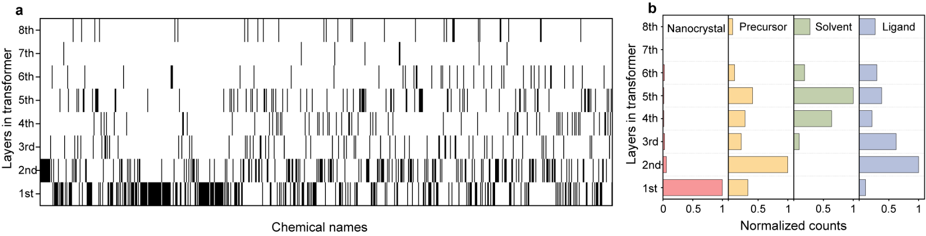 图4. (a)编码物质的最大注意力权重在不同transformer层的分布,图中每条竖线的横坐标对应一个物质名称,横坐标对应transformer的第几层;(b)不同功能类别物质的数量分布图