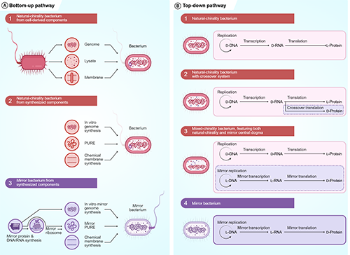 - 系统综述镜像生命的构建路径:从镜像核酸、镜像蛋白质到镜像细胞的“自下而上”与“自上而下”合成策略。