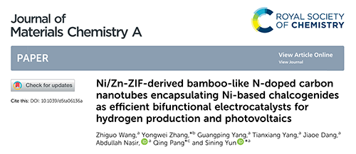 近日,来自西安建筑科技大学云斯宁教授“新能源材料”研究团队与合作者在国际知名期刊《Journal of Materials Chemistry A》上发表题为“Ni/Zn-ZIF-derived bamboo-like N-doped carbon nanotubes encapsulating Ni-based chalcogenides as efficient bifunctional electrocatalysts for hydrogen production and photovoltaics”的研究文章。该研究以Ni/Zn-ZIF为前驱体,通过高温热解与原位硒化/碲化处理,成功构建了具有“竹节状”氮掺杂碳纳米管(NCNT)封装NiSe或NiTe纳米颗粒的双功能催化剂(NiSe@Ni–N–C与NiTe@Ni–N–C)。该结构通过Ni–Nₓ位点与Ni基硫族化物的协同作用,构建了多重催化活性中心。此外,碳管封装有效防止了金属颗粒的腐蚀与聚集,显著增强了催化剂的稳定性。