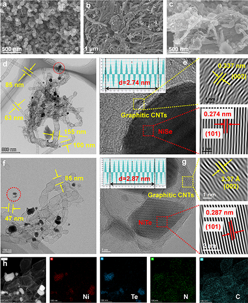图2.(a)Ni NPs@Ni-N-C,(b)NiSe@Ni-N-C和(c)NiTe@Ni-N-C的SEM图像;NiSe@Ni-N-C的(d)TEM图像和(e)HRTEM图像(插图为NCNTs和NiSe的IFFT图像);NiTe@Ni-N-C的(f)TEM图像和(g)HRTEM图(插图为NCNTs和NiTe的IFFT图像);(h)NiTe@Ni-N-C的HAADF-STEM图及Ni、Te、N和C元素的EDS映射图。